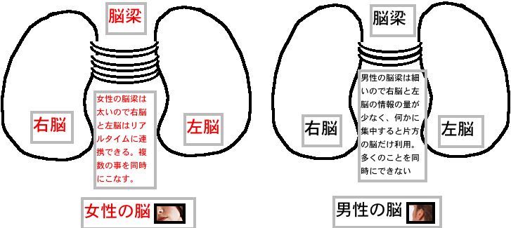 全員に完璧に当てはまるというわけではありませんが、一般的に男性の脳はあるひとつのことに集中して働くのに対し、女性の脳は同時に複数のことに対応して働くと言われています。