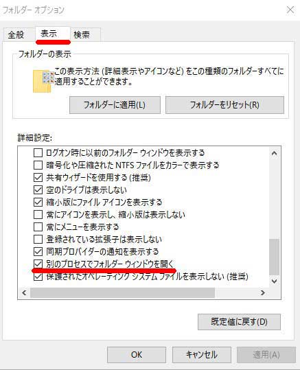 - 詳細設定を一番下までスクロールして、一番下から二番目の「別のプロセスでフォルダーウィンドウを開く」にチェックを入れます。