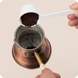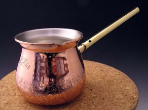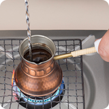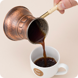 ターキッシュコーヒーは、イブリックまたはジェズベと呼ばれる柄杓型の小さな鍋を火にかけて作り、コーヒーの粉もそのまま一緒に小さなカップに注いで飲むのが特徴です。