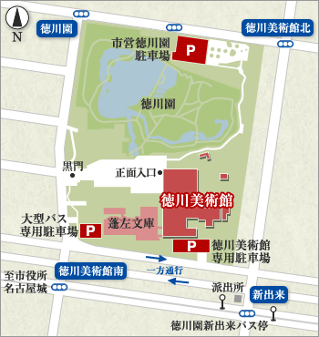 名古屋ICで降りた後、県道60号(東山通)を名古屋市街に向かって約8km直進し、「今池」交差点を右折して約1.3km、「古出来」交差点を左折して約0.7kmほどで「徳川美術館南」交差点につきます。